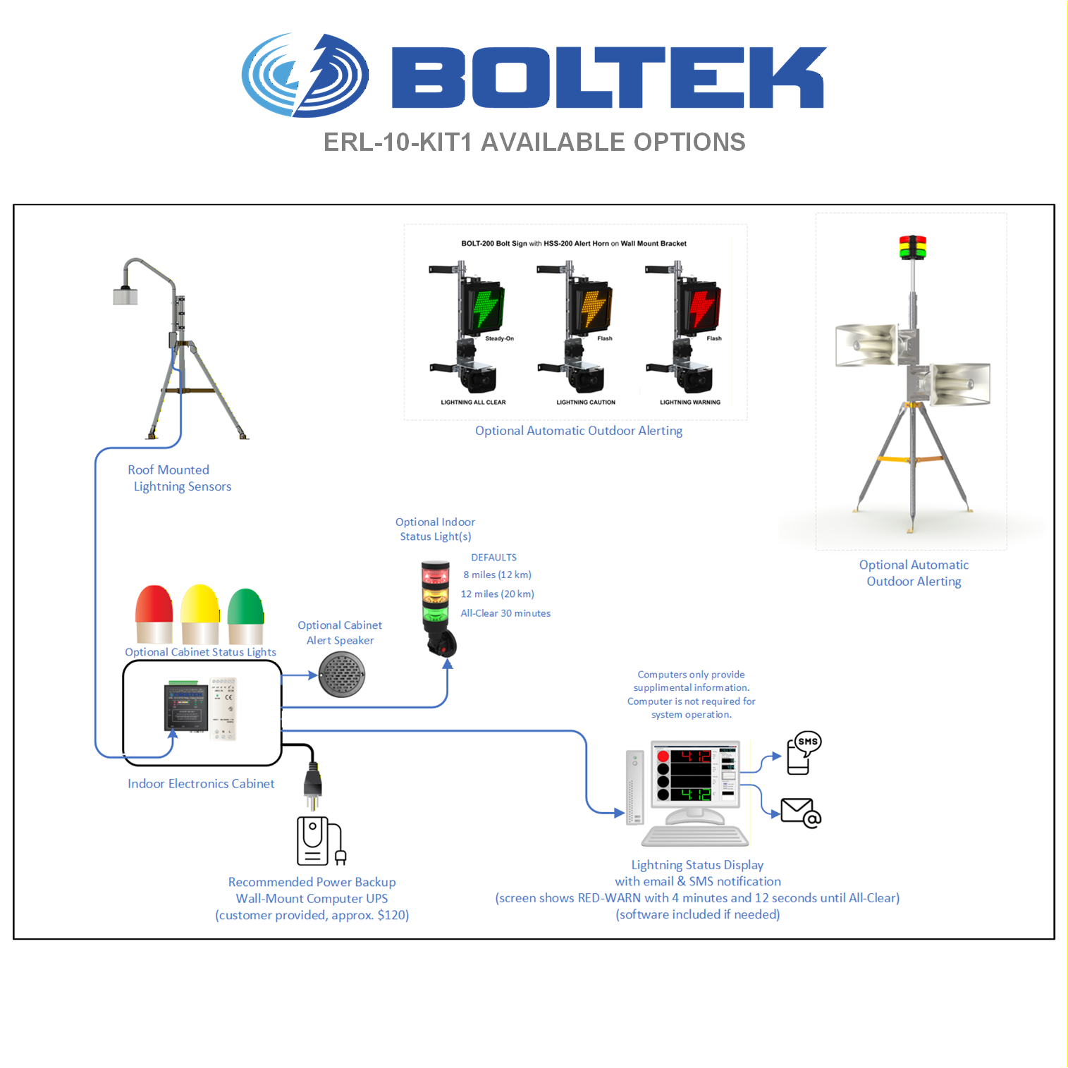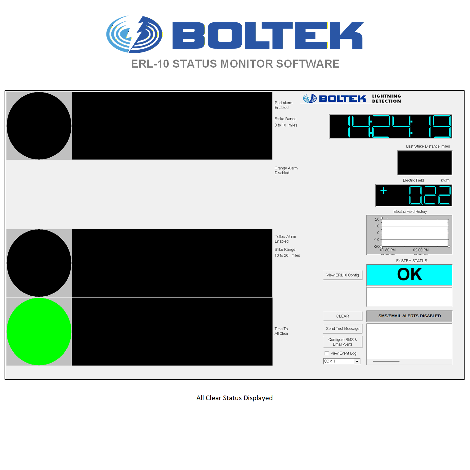 The ERL-10 Status Monitor software (included) allows the system status and countdown timers to be displayed. Countdown timers clearly indicate the number of minutes until All Clear. Alert activations are timestamped and logged to disk. Graphical log file viewing software is also included.