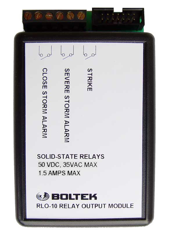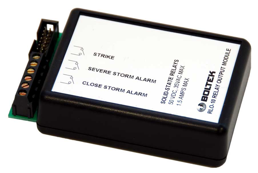 The RLO-10 Relay Output Module provides three solid-state relay outputs for interfacing external devices to the LD-250 or LD-350 alarms and strike indicators. External devices such as PLC inputs or auxiliary indicators can be activated when the LD-250 or LD-350 alarm activates.